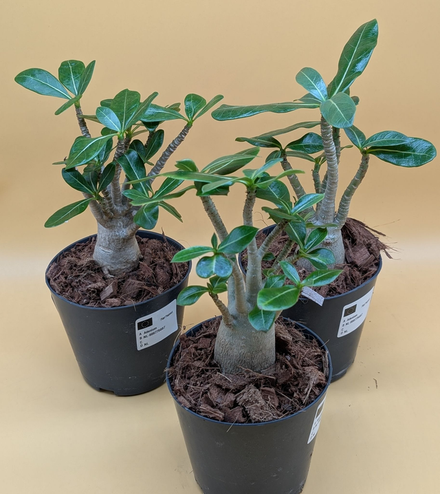 Adenium obesum, auch Wüstenrose genannt, ist eine pflegeleichte, sukkulente Strauchpflanze, die in den trockenen Regionen Afrikas und Arabiens beheimatet ist. Sie zeichnet sich durch einen verdickten Stamm (Caudex) aus, in dem sie Wasser speichert, und produziert im Frühling und Sommer leuchtende, oft rosafarbene oder rote, rosenähnliche Blüten. Wegen ihres giftigen Milchsaftes sollte sie nicht in Reichweite von Kindern und Haustieren aufgestellt werden