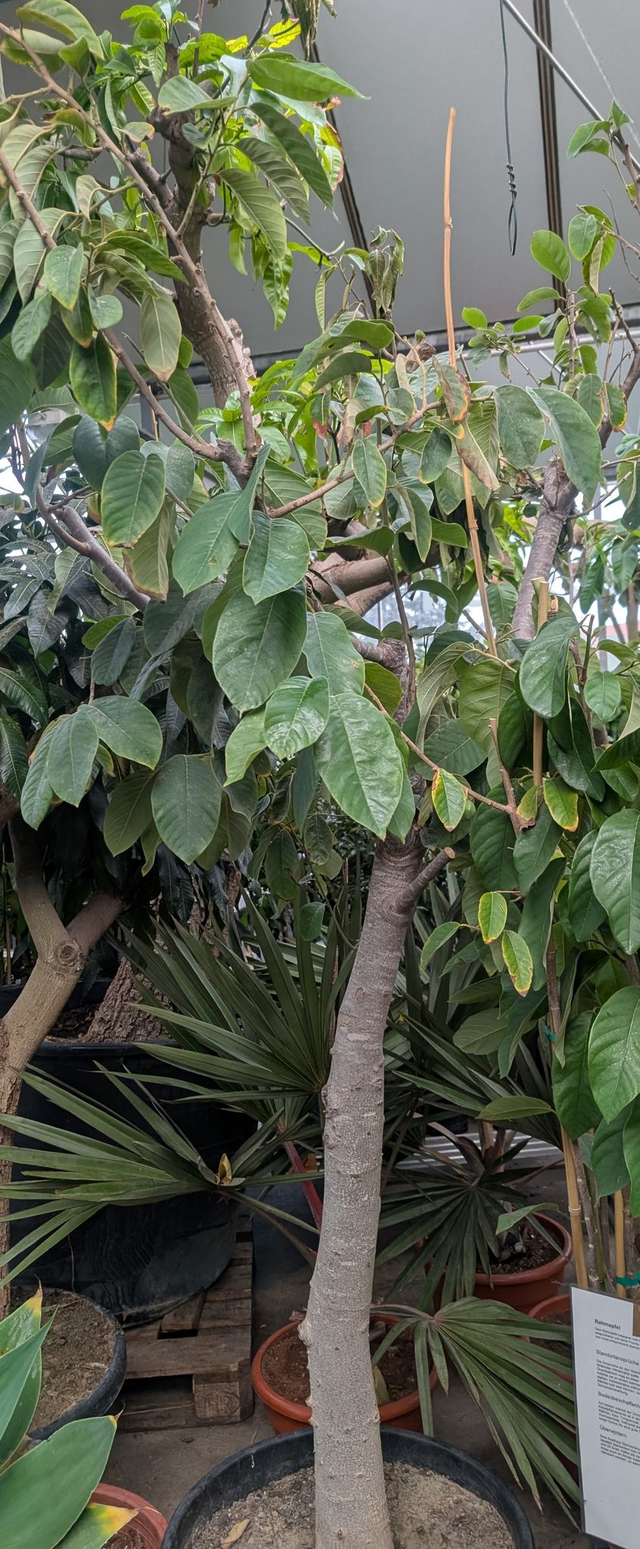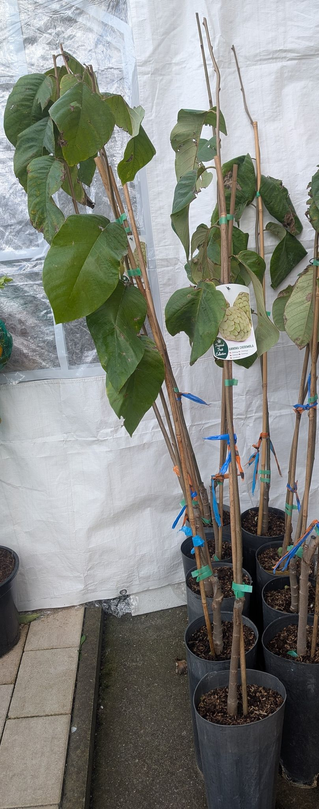 Die Cherimoya ist ein kleiner bis mittelgroßer, schnellwachsender Baum oder Strauch, der 5 bis 9 Meter hoch werden kann. Sie hat eine ausgebreitete Krone, ist oft halb-immergrün und die jungen Zweige sind rötlich behaart. Die Blätter sind oval und dunkelgrün. Die Frucht ist herzförmig bis konisch, mit einer schuppigen grünen Schale und cremig-weißem, saftigem Fruchtfleisch