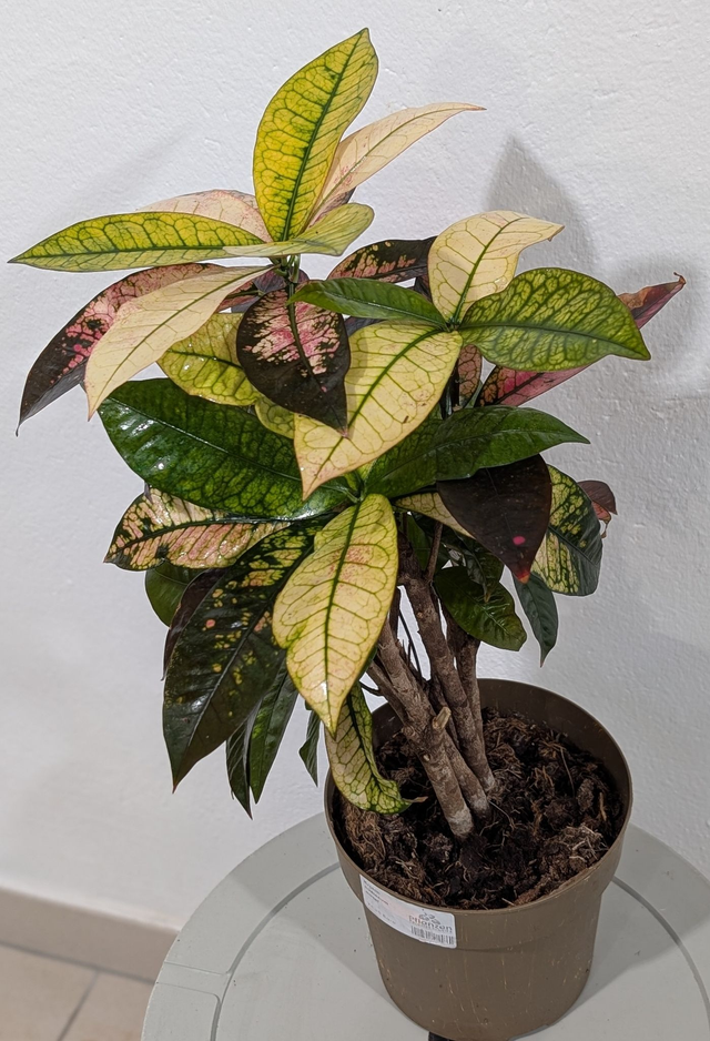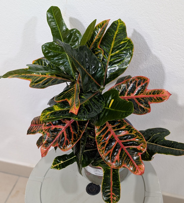 Der Croton (Codiaeum), auch bekannt als Wunderstrauch, ist eine farbenprächtige Zimmerpflanze mit leuchtenden, bunten Blättern in Gelb, Rot, Orange oder Violett. Ursprünglich aus Südostasien stammend, ist er eine immergrüne Pflanze mit einer strauchförmigen Wuchsform, die eine Höhe von bis zu 120 cm erreichen kann. Die Pflanze bevorzugt einen hellen, sonnigen Standort (ohne direkte Mittagssonne) und benötigt regelmäßig Wasser und eine hohe Luftfeuchtigkeit, ist aber für Menschen und Tiere giftig