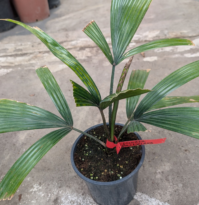 Licuala-Arten sind tropische Fächerpalmen, die sich durch ihre runden, fächerartigen Blätter auszeichnen und bis zu 2,5 Meter hoch werden können. Sie benötigen warme, feuchte Standorte mit hellem, indirektem Licht und kommen gut in Bädern oder Küchen zurecht. Sie sind empfindlich gegenüber Kälte und Trockenheit und erfordern eine gleichmäßige, aber nicht Staunässe bildende Bewässerung