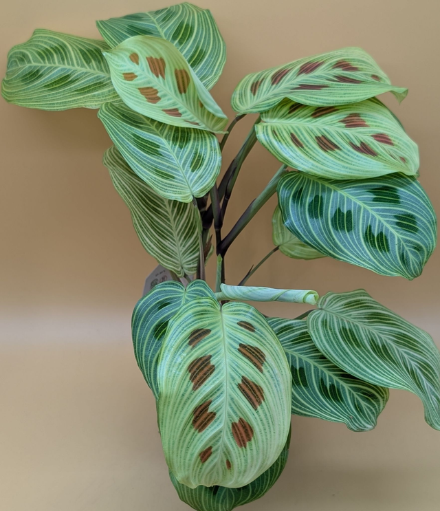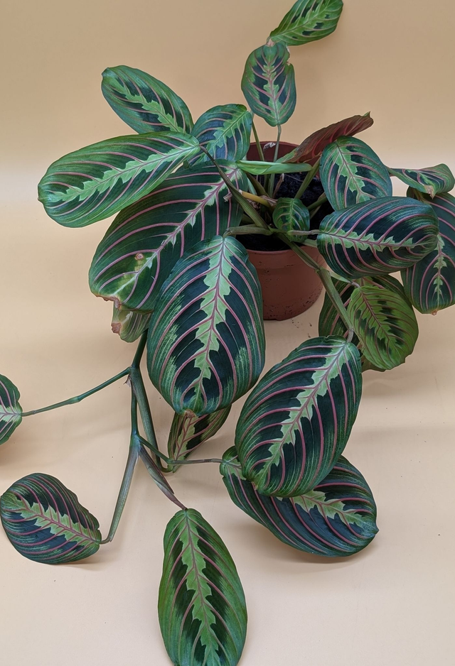 Die Maranta, auch bekannt als Gebetspflanze, ist eine pflegeleichte, tropische Zimmerpflanze aus Brasilien, die für ihre auffälligen, eiförmigen Blätter mit unterschiedlichen Mustern aus Flecken, Tupfen und Adern bekannt ist. Tagsüber hängen die Blätter herab, und nachts rollen sie sich wie betende Hände zusammen. Die Pflanze wächst kriechend und überhängend, wird etwa 40-60 cm hoch und ist ideal für Blumenampeln.