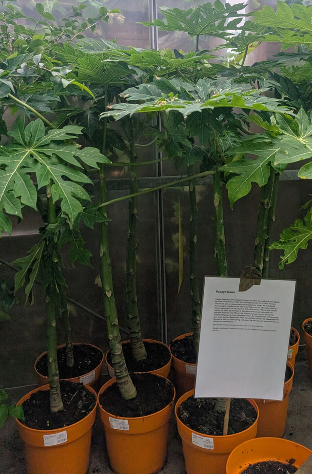 Der Papayabaum ist ein schnellwachsender, tropischer Baum, der sich durch einen aufrechten, unverzweigten Stamm auszeichnet, der eine schirmartige Krone aus großen, handförmig gelappten Blättern trägt. Er kann bis zu 10 Meter hoch werden und wird aufgrund seiner kurzen Lebensdauer und weichen Struktur auch als "baumförmiges Kraut" bezeichnet. Die weißlichen Blüten entwickeln sich zu eiförmigen Früchten, die botanisch Beeren sind.