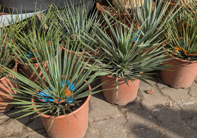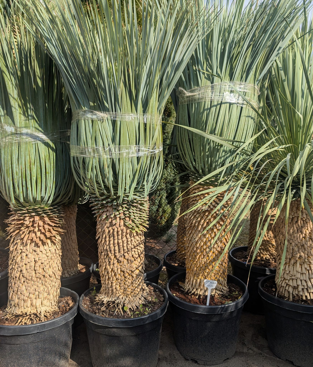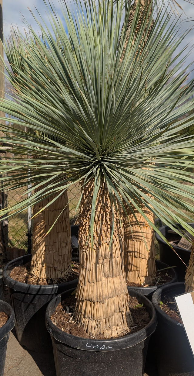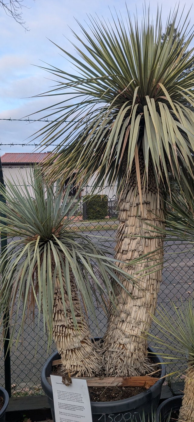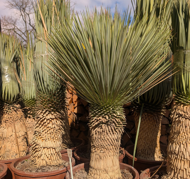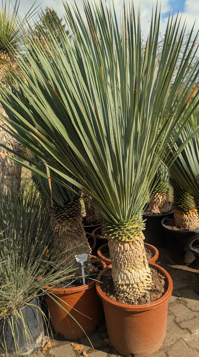 Die Yucca rostrata, auch blaublättrige Palmen Lilie genannt, ist eine immergrüne, langsam wachsende Wüstenpflanze aus dem Südwesten der USA und Mexiko. Sie zeichnet sich durch ihren Stamm aus, der bis zu 4,5 Meter hoch werden kann, sowie durch ihre spitzen, graublauen Blätter, die eine kugelförmige Krone bilden. Im Sommer entwickelt sie hohe, verzweigte Blütenstände mit weißen, glockenförmigen Blüten. Die Pflanze ist sehr trockenheits- und hitzetolerant und kann unter trockenen Bedingungen Temperaturen bis −20∘C standhalten, was sie für den Garten attraktiv macht. Sehr Winterhart.